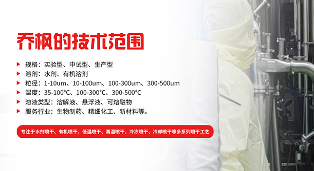 上海喬楓實業有限公司,成立于2012年,是從事噴霧干燥設備的研發設計、生產、銷售(小型噴霧干燥機實驗型噴霧干燥機35℃低溫噴霧干燥機有機溶劑噴霧干燥機,低溫閉式循環噴霧干燥機超細粉末噴霧干燥機噴霧冷凍干燥機、真空噴霧干燥機、氣流噴霧干燥機,噴霧造粒干燥機,離心噴霧干燥機沸騰制粒機等)和售后于一體的綜合性公司,本公司現成為一家致力于為生物制藥、精細化工、新能源、陶瓷造粒及食品工程等領域提供全套解決方案的整線交鑰匙工程企業。